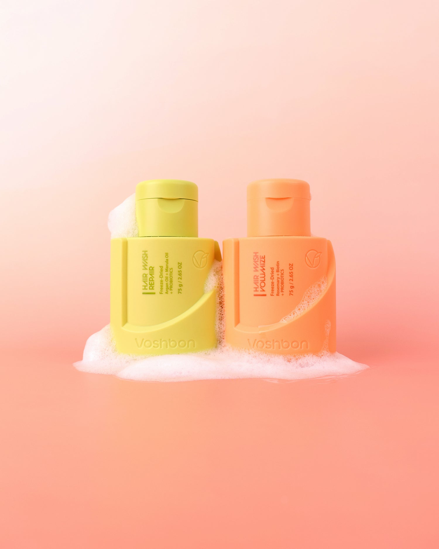 One 75g bottle of Voshbon replaces roughly 750ml of traditional liquid cleansers, reducing packaging, water use, and carbon emissions during transport.
