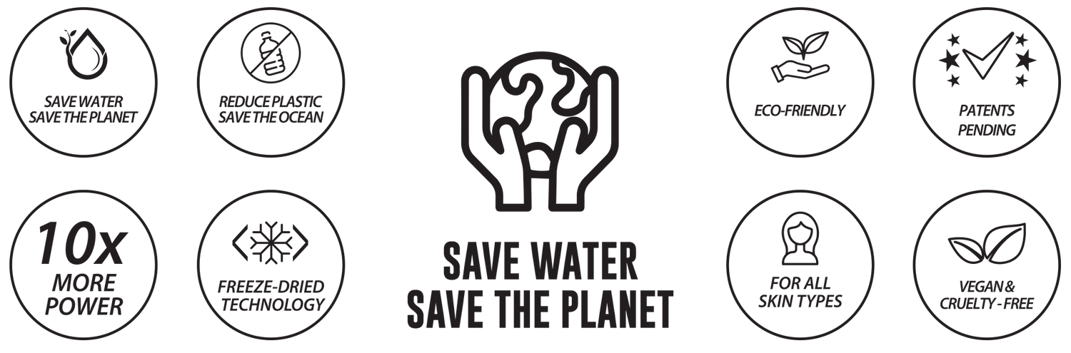 Our water-free, freeze-dried formulations eliminate the 80–90% water found in traditional beauty products—preserving precious resources, delivering more concentrated actives, and reducing carbon emissions from production and transport.